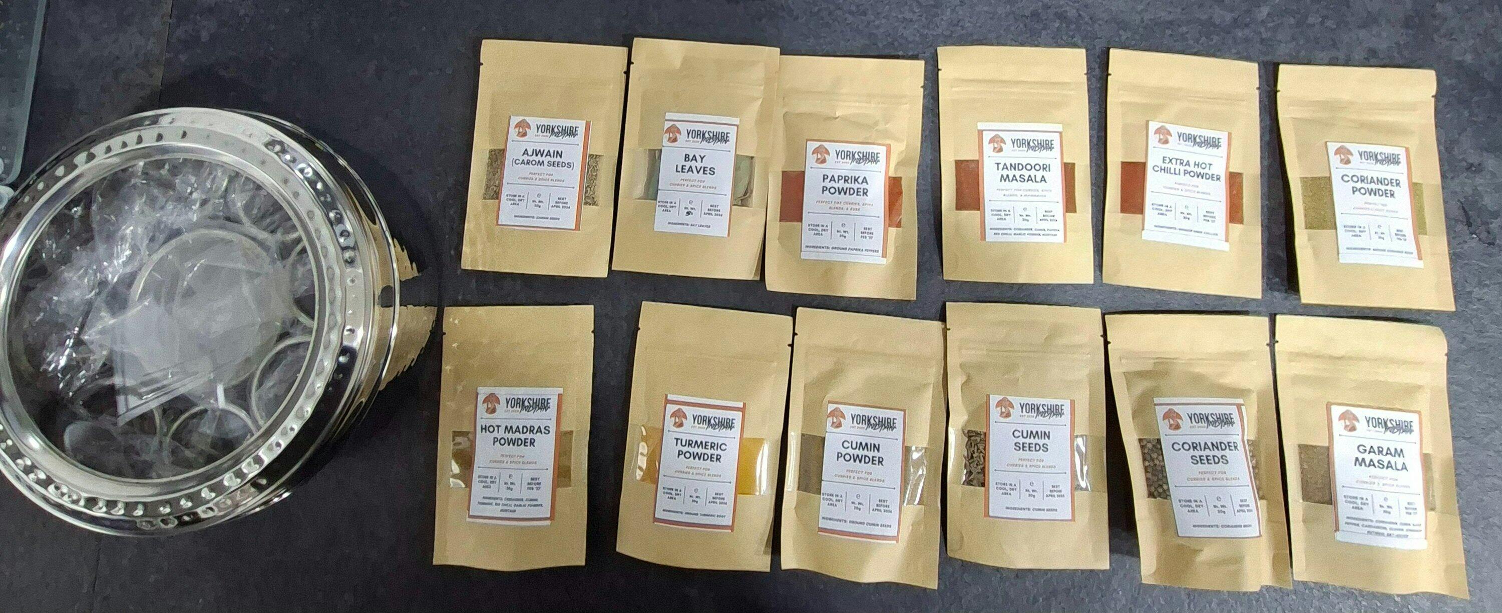 Garam Masala (20 g) • Turmeric (20 g) • Coriander Powder (20 g) • Cumin Powder (20 g) • Chilli (HOT - 20 g) • Madras (HOT - 20 g) • Paprika (20 g) • Tandoori Masala (20 g) -